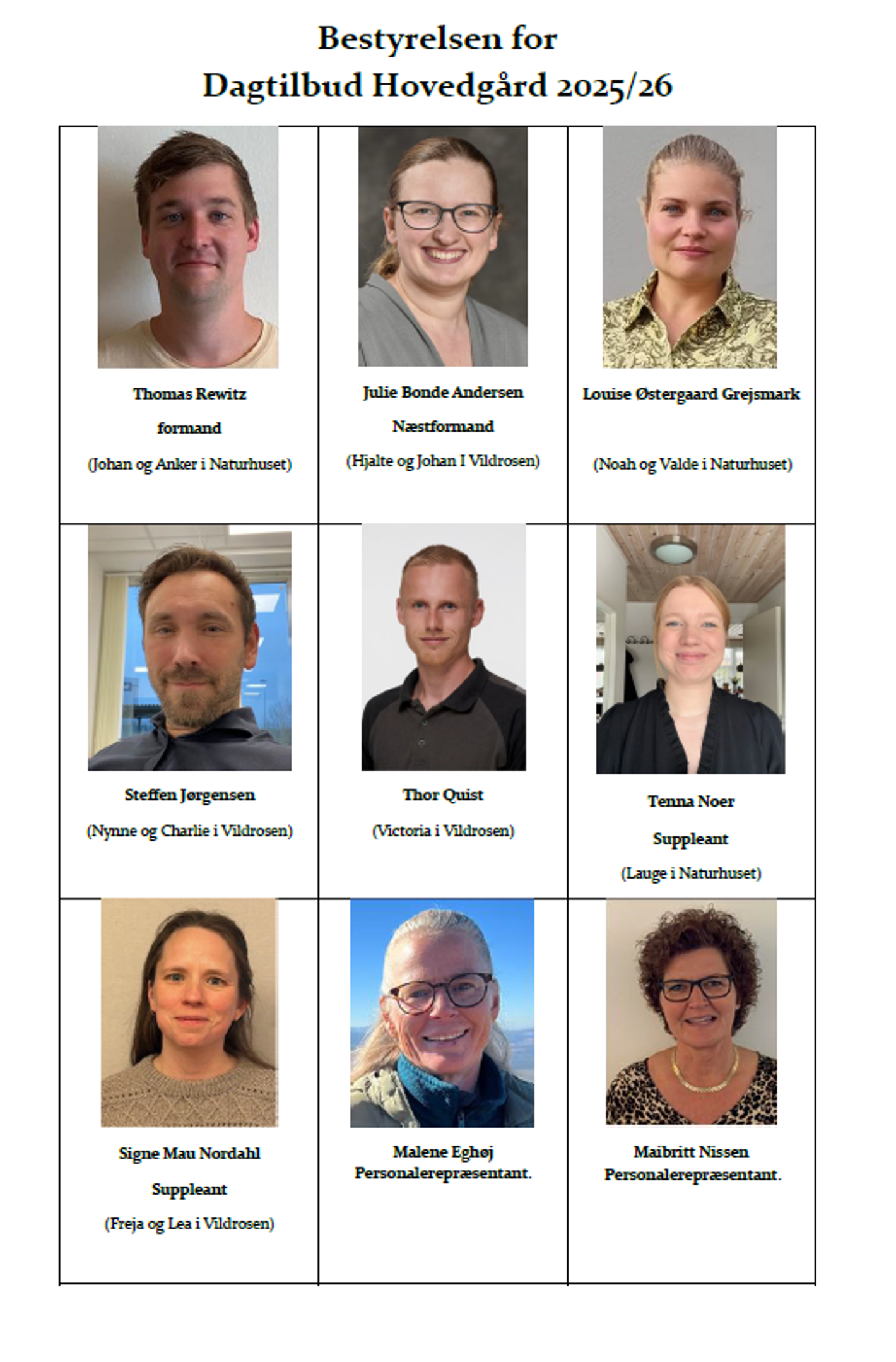Sammen med repræsentanter fra personalegruppen og ledelsen, forsøger bestyrelsen at omsætte de politiske visioner for et godt børneliv til nogle sjove og hyggelige dage i institutionen og i dagplejen.