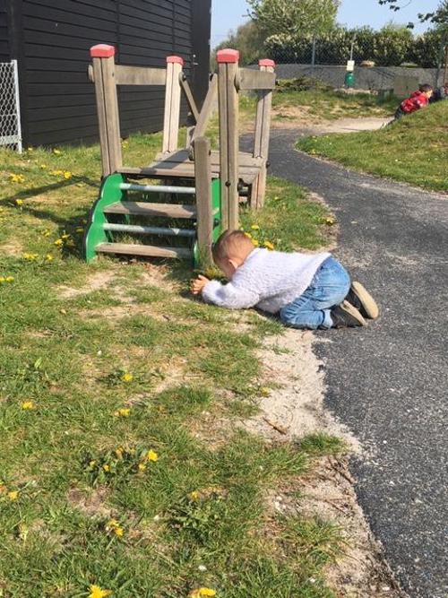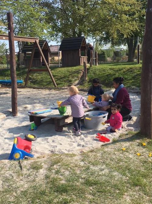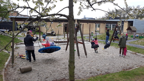 Vi opholder os meget på vores store og inspirerende legeplads hvor børnene laver mad i vores bålhytte i skoven, leger fangeleg på forhindringsbanen, finder smådyr i vores insekthoteller, spiller bold på multibanen, hjælper med at plante blomster og krydderurter i vores plantekasser, gynger, klatre i træer, mooncar ræs på cykelbanen eller andre sjove lege. Vuggestuen har 3 ladcykler, så vi er tit på tur ud i det blå.