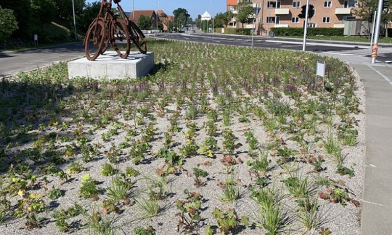 Et stort bed med tusindvis af smukke, insektvenlige planter i forbindelse med det færdigomlagte vejkryds ved Langmarksvej/Sundvej i Horsens. Det er ét aktuelt eksempel på, hvordan biodiversitet tænkes ind i kommunens planlægningen af forskellige typer anlægsprojekter - til glæde for mennesker, bier og sommerfugle.