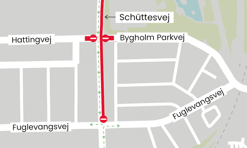 Mens arbejdet står på, vil der i krydset kun være åbent for den trafik, der kommer fra nord og kører mod syd på Schüttesvej og videre over på Ringvejen. For trafik, der kommer fra Hattingvej, Ringvejen og Bygholm Parkvej, vil der være spærret i krydset.