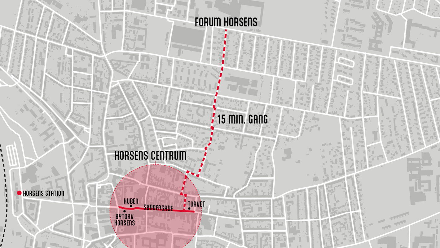 Det tager cirka 15 minutter at gå fra Forum Horsens til Torvet – hjertet af byen med caféer, shopping og liv. Herfra ligger gågaden lige rundt om hjørnet.